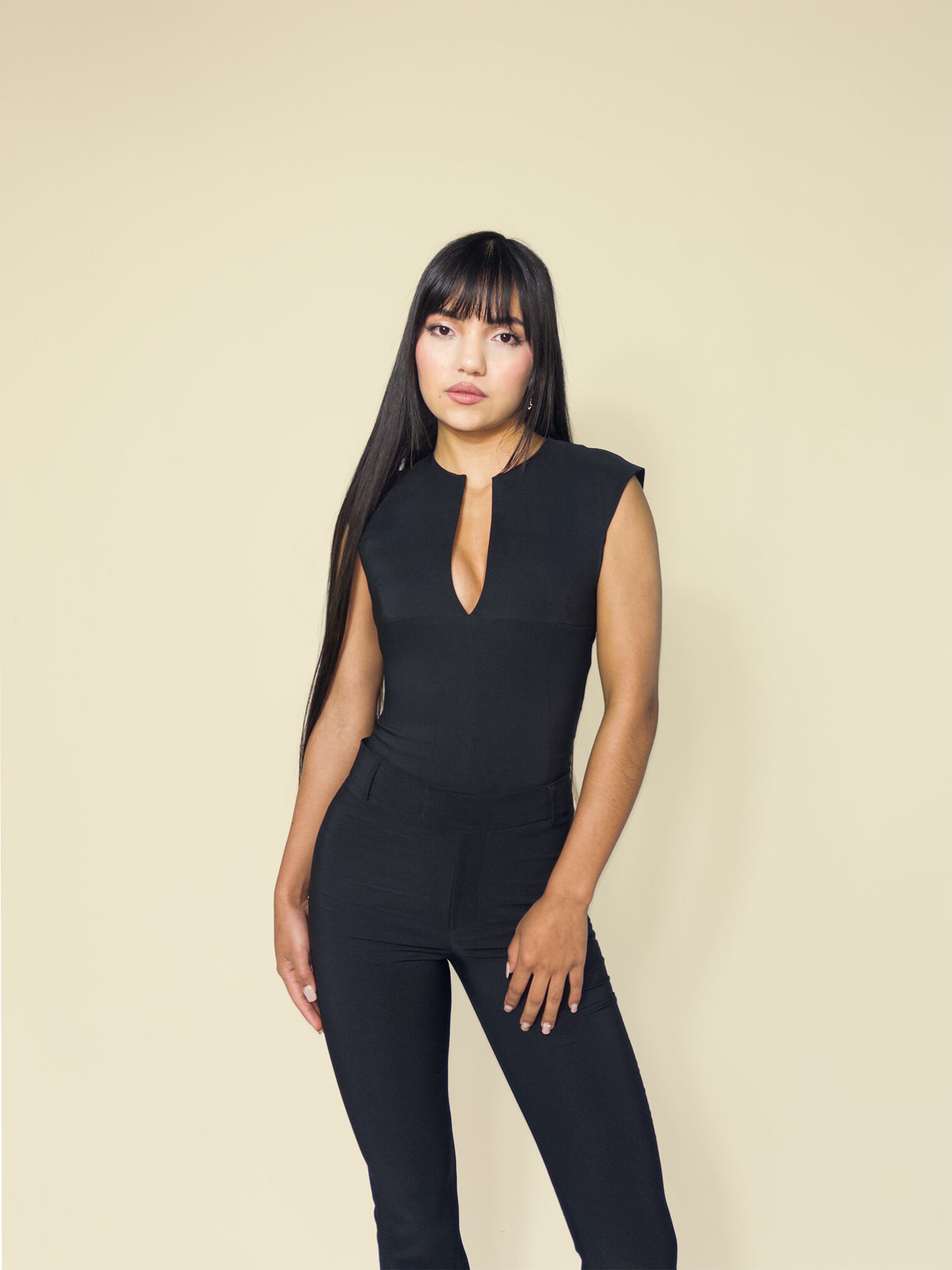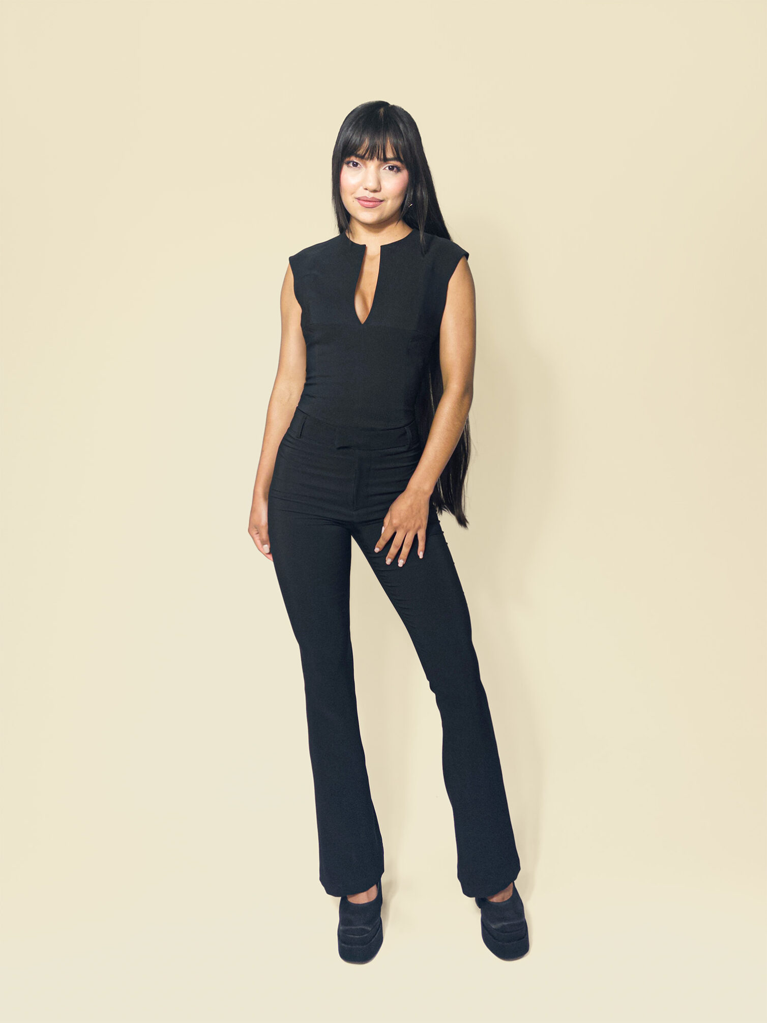 Pantalón bota campana confeccionado en Noches de Viena 92% poliéster 8% spandex, de textura fluida y caída elegante. Su diseño de talle alto estiliza la figura con una silueta continua sin pinzas ni bolsillos frontales, y detalle de ribetes posteriores que aportan un acabado pulido. Una prenda versátil y atemporal, ideal para crear conjuntos sofisticados tanto de día como de noche. Composición: 92% poliéster 8% spandex (noches de viena)